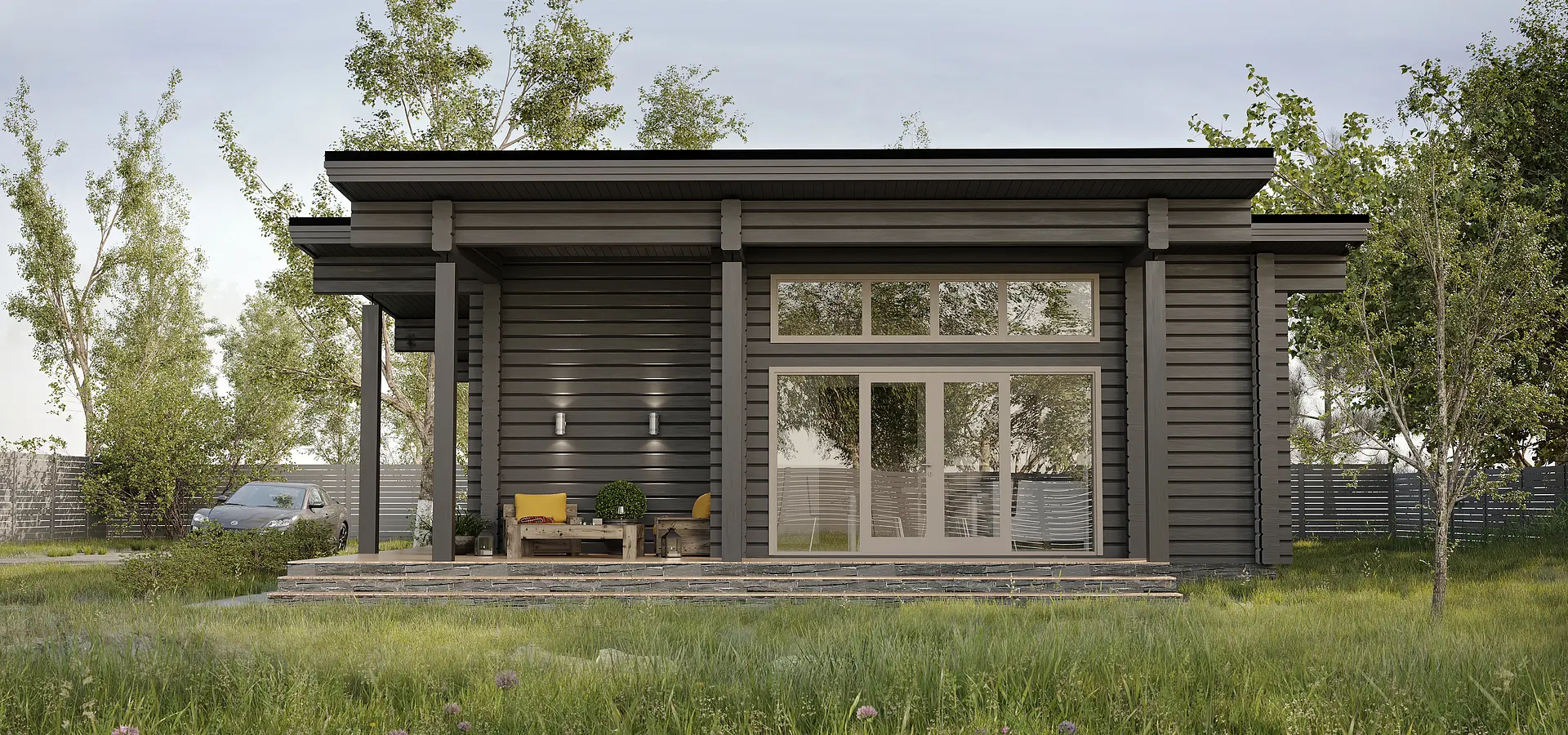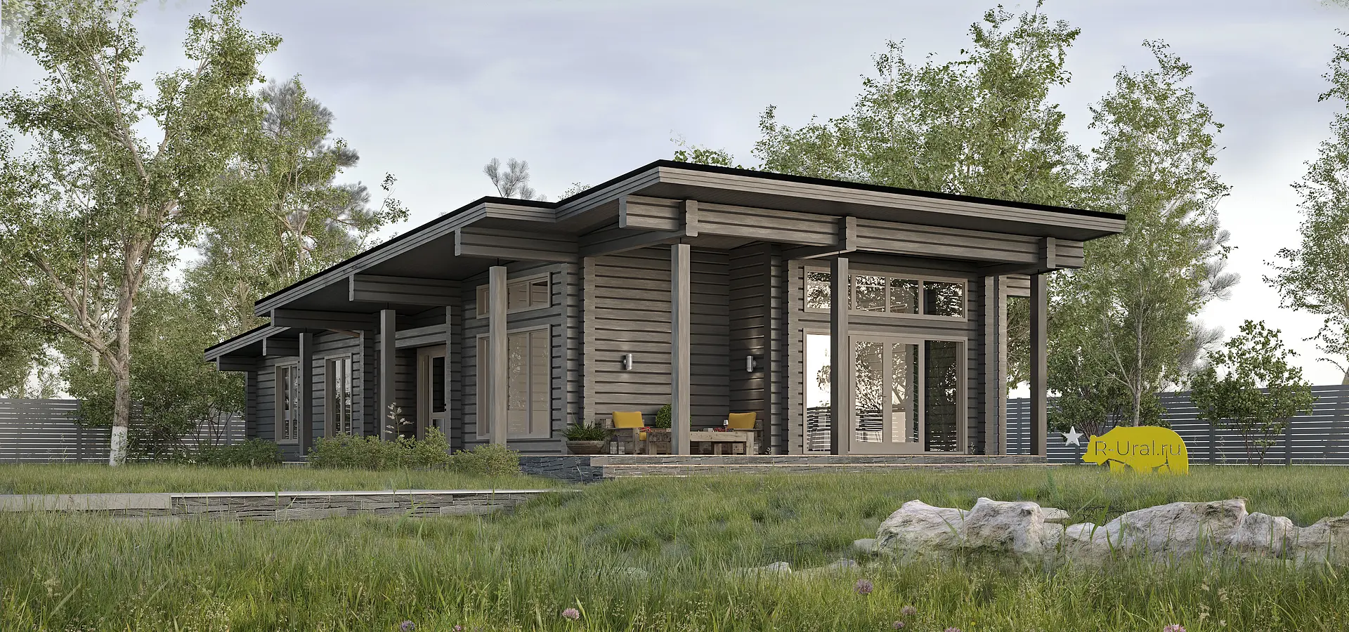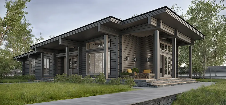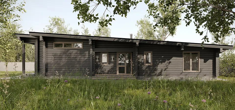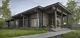 Некоторые скажут, что минимализм и деревянные технологии - это не возможно или не сочитаемо. Данный проект наглядный пример современных тенденций. Горизонтальная разлиновка клееного бруса гармонично вписалась и дополнила данный стиль визуально вытянув строения в длинну. Уникальность функциональности заключается в кровле, высота которой постепенно увеличивается со стороны спального блока в сторону общественного (кухни-столовой-гостинной). Большие свесы защищают от осадков и воздействия ультрофиолета. Планировка делится на три независимые зоны: спальный блок, техническая зона и общественная. Обходная терраса не только увеличивает комфортное пространство, но и благоприятно влияет на эстетическую составляющую.