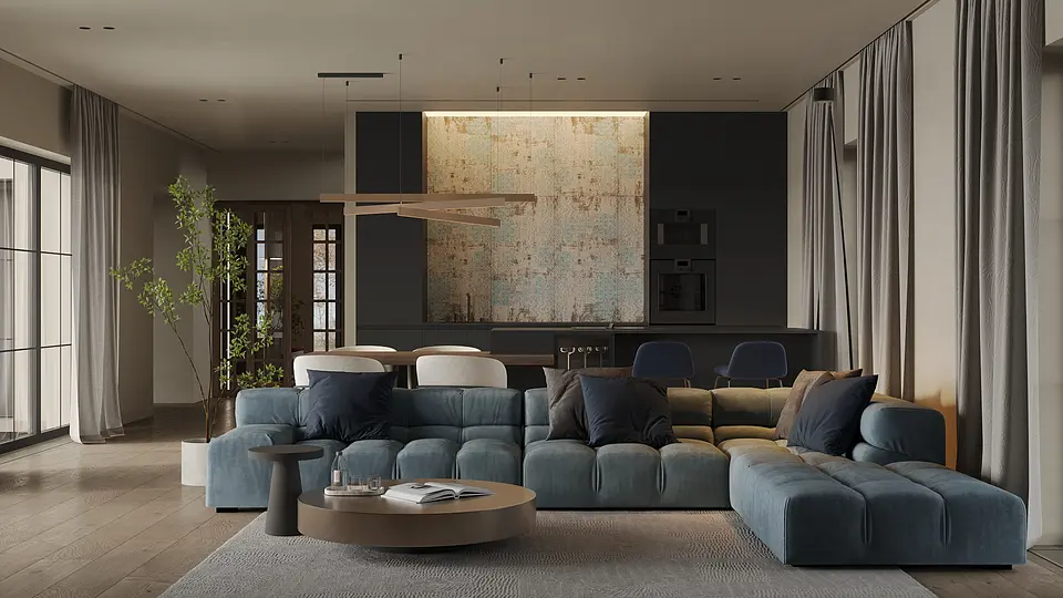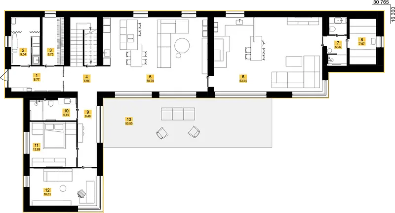 Это пространство создано для двоих. Второй этаж — это личный мастер-блок хозяев. Первый же этаж раскрывается для общения и отдыха: здесь нашлось место и для просторной кухни-гостиной, и для летней кухни с полноценной зоной барбекю, где так приятно проводить время после жара парной.