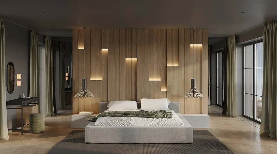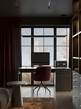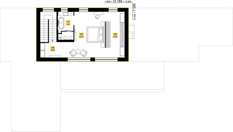 Эргономика парной следует лучшим традициям скандинавского подхода: полоки расположены друг напротив друга, а узкое вертикальное окно напротив печи наполняет пространство светом и воздухом. В отдельном крыле дома, сохраняя приватность гостей, расположились спальня и кабинет. Каждая зона здесь живет своей жизнью, но вместе они создают идеальный баланс для уединенной и комфортной жизни.