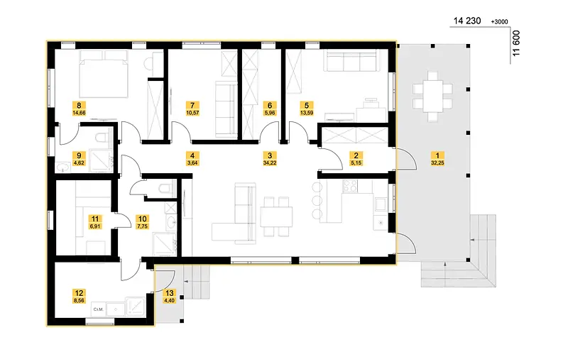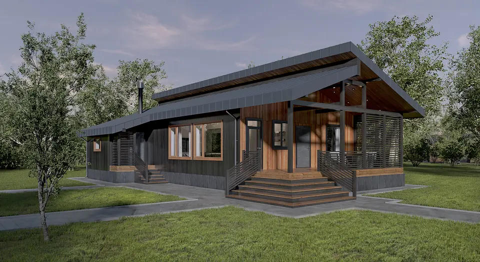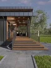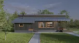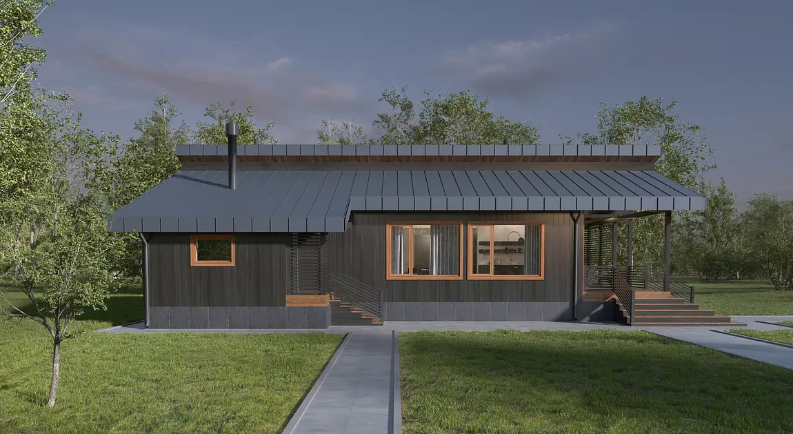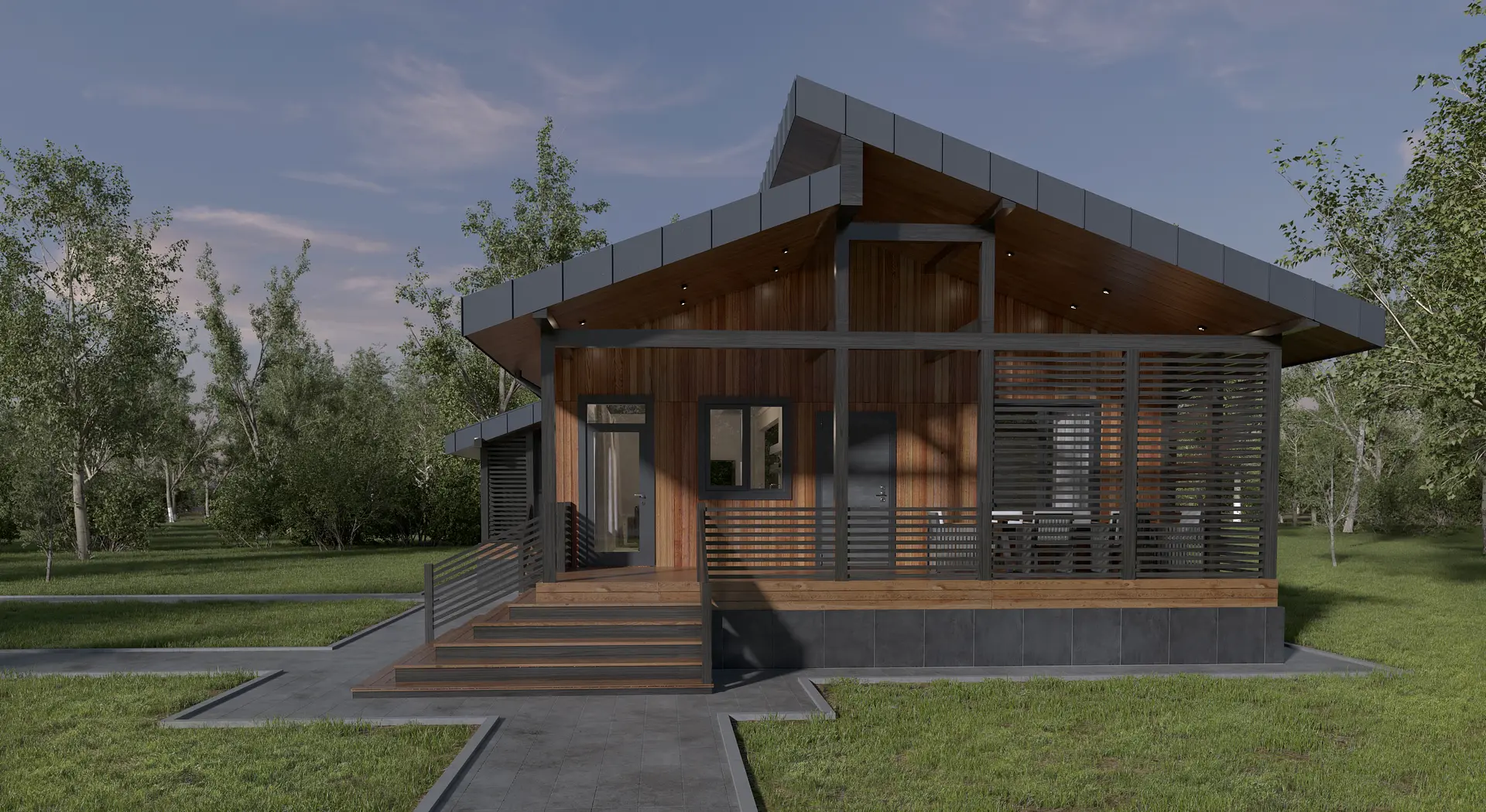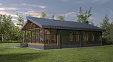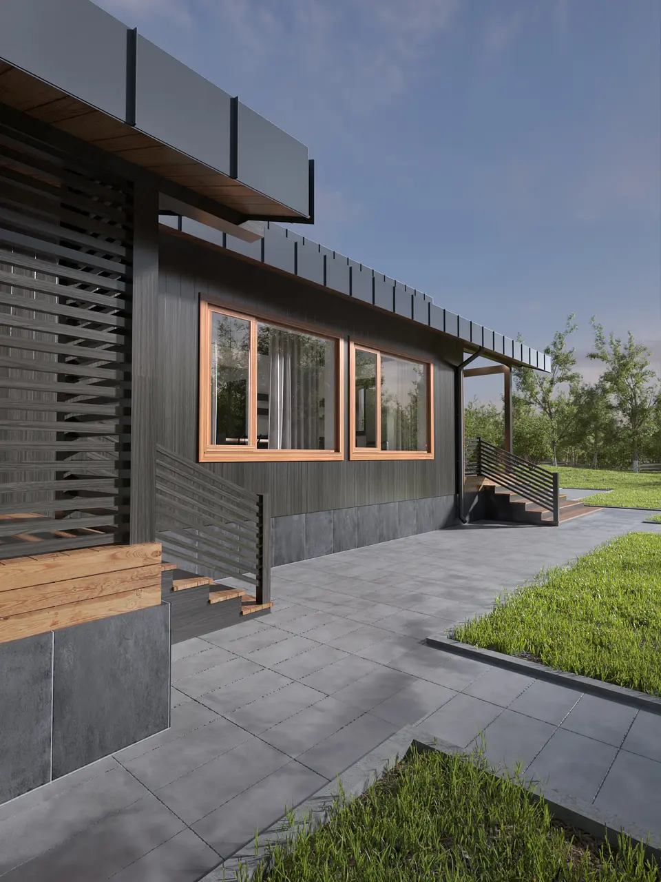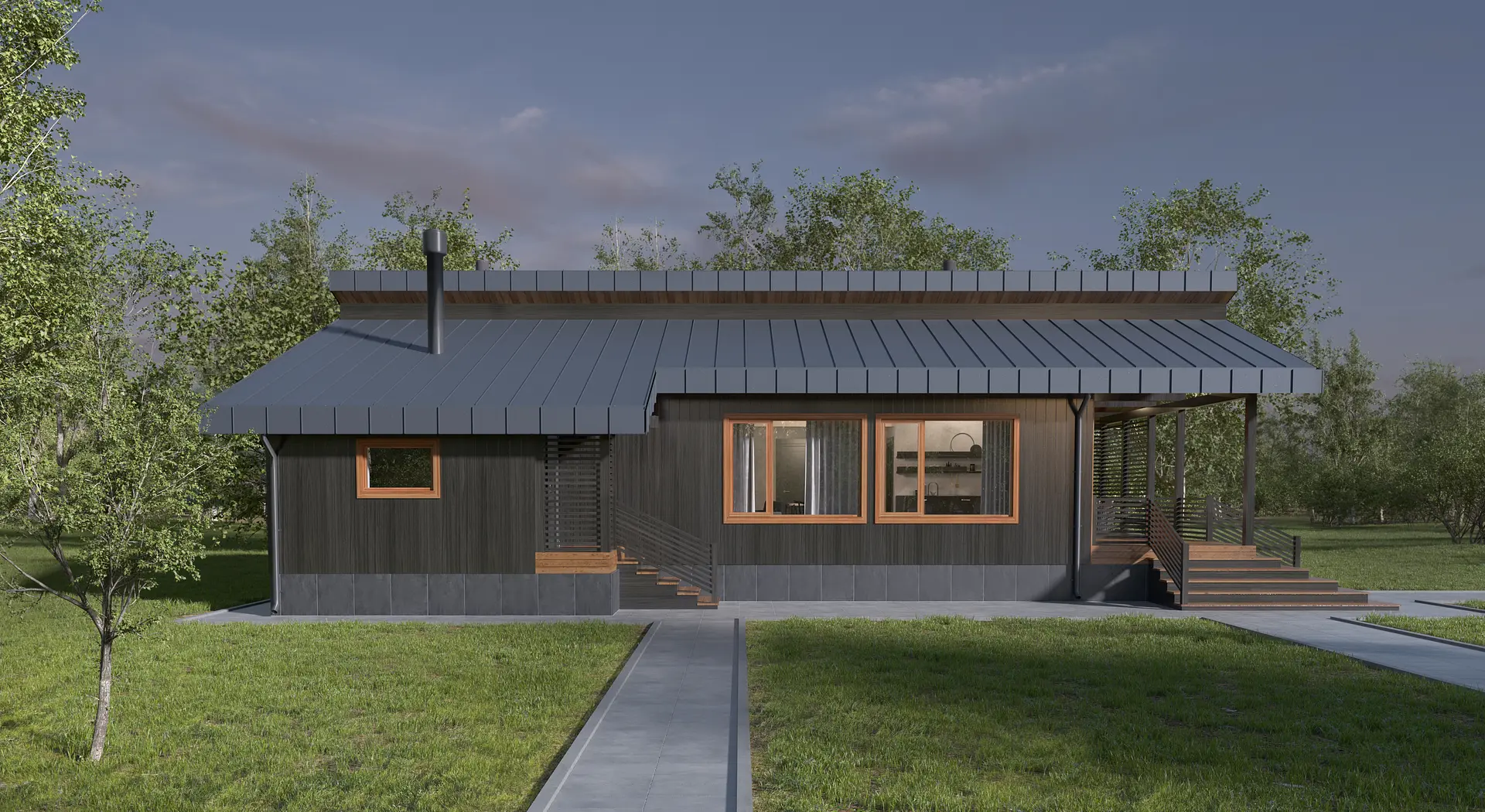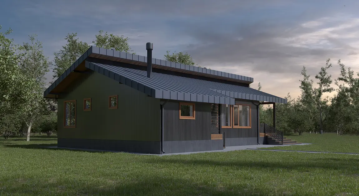Планировочное решение обусловленно расположением на земельном участке и сторонами света, таким образом крыльцо пришлось совместить с террасой. Дом проектировался для постоянного проживания двух человек, но в нем предусмотренно пространство для работы и отдельная комната для размещения гостей. Как в лучших традициях Финляндии, строение содержит в себе парную с отдельным выходом через котельную. Цвет фасада и форма так же были выбраны в Скандинавском стиле.