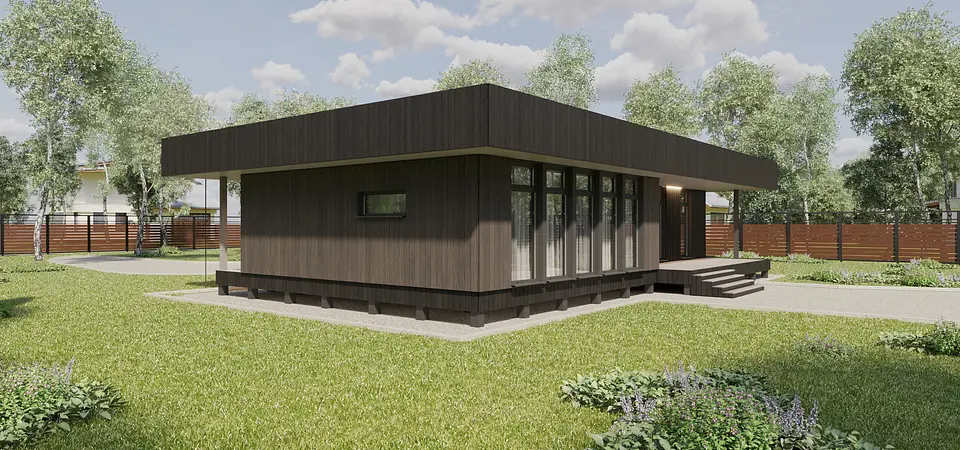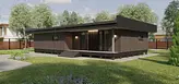 Проект был разработан по каркасной технологии для серийного строительства в Свердловской области. Задача состояла в создании оптимальной конструкции и уникального планировочного решения, которое подходило бы к большинству земельных участков благодаря возможности зеркального отображения (отзеркаливания). Архитектура решена в стиле хай-тек. Особенностью являются большие нависающие свесы по периметру дома, а кровля выполнена как односкатная, что повышает надежность и упрощает монтаж. Стоимость проекта фиксирована, и ее можно уточнить в компании «Разработки Урала».