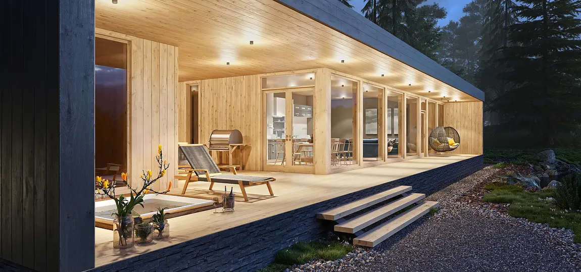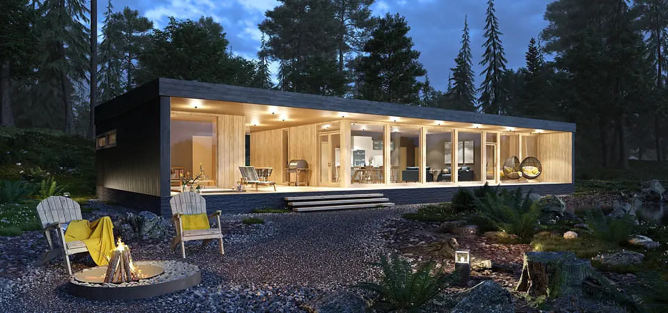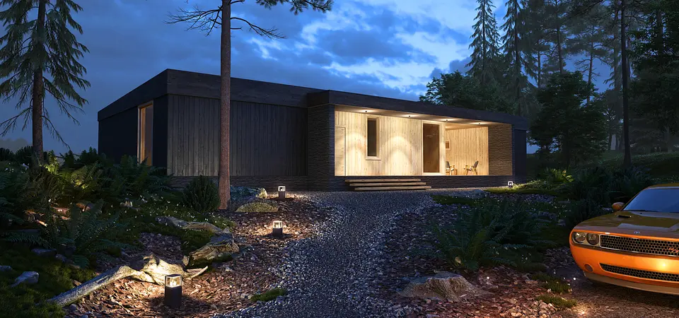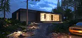 Дом разрабатывался в комплексе типовых проектов, с учетом отправки комплекта материалов в морском контейнере для строительства в Калифорнии. Уникальность строения заключается в его функциональности, оно включает в себя основной дом, СПА-зону и обходную террасу со сквозным проходным элементом объединяющую с входным крыльцом.