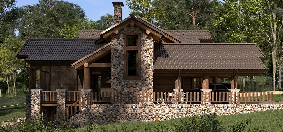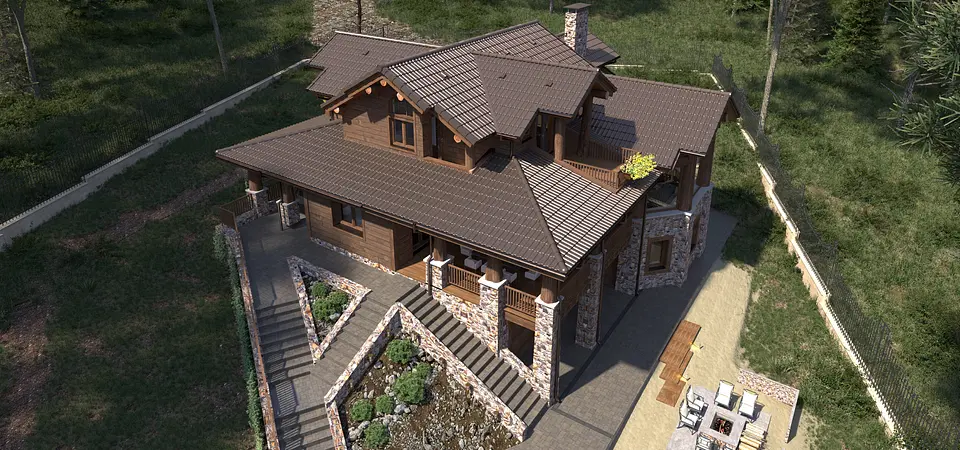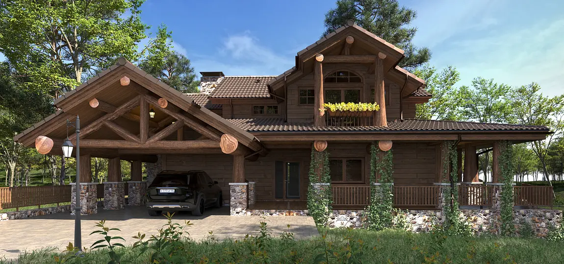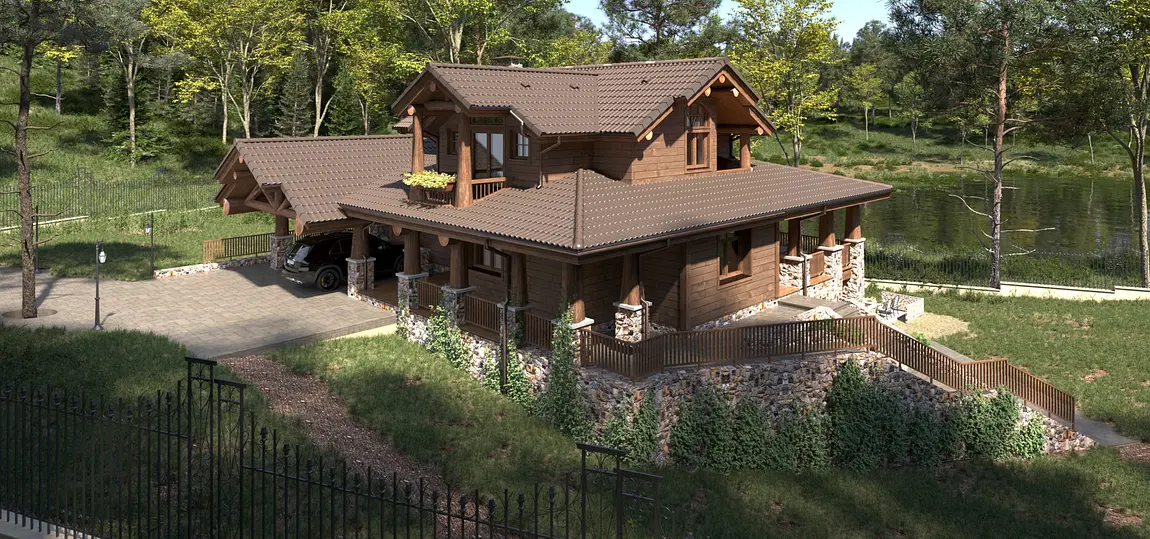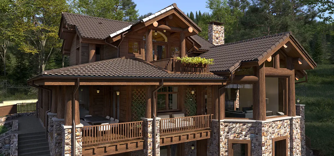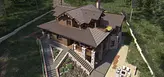 Очень редкий стил, называется "Американское шале". Прототип (аналог) был взят из провинции горной Канады. Дом распологается на крутом спуске к Мариинскому водохранилищу. Таким образом образовался цокольный этаж, в которо разместились технические зоны и спа комплекс. Из-за сложной конфикурации строения, пришлось применить большое сочетание строительных технологий: монолит, блок, каркас и Post & Beam.