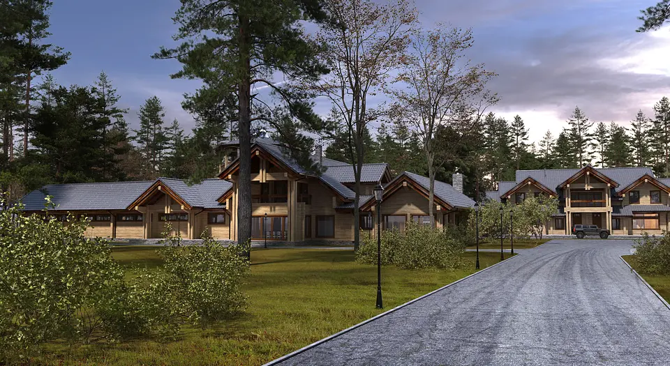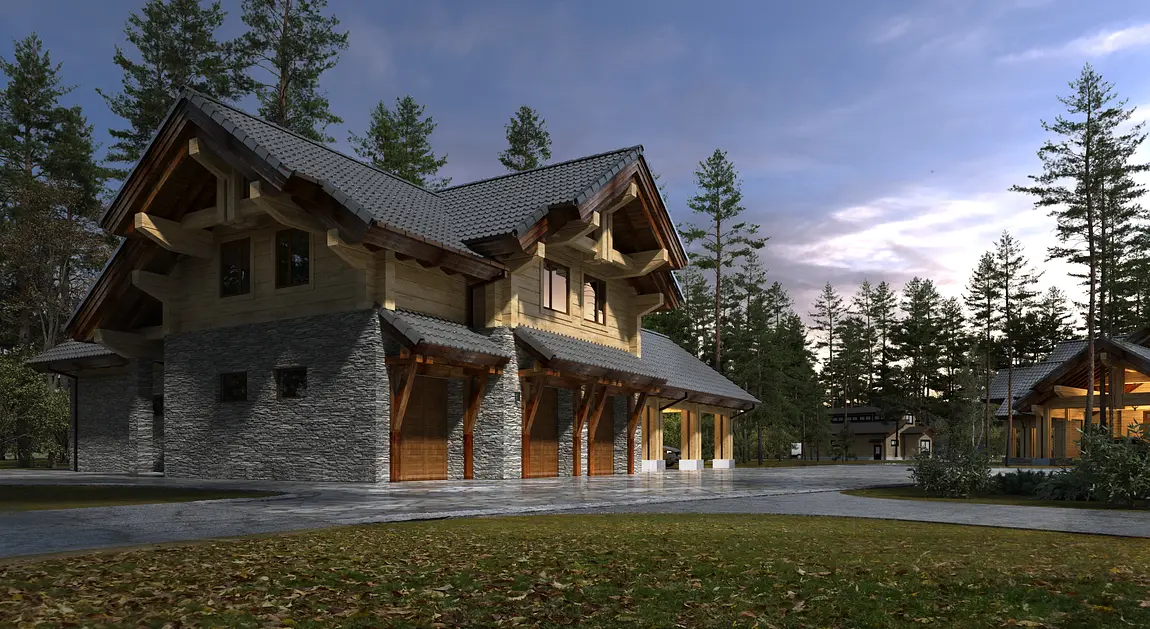 Благодаря массивности строения и использованию выразительных элементов, таких как стропильные фермы (как и в основном доме), стиль можно обозначить как «скандинавский» с отсылками к русскому зодчеству. Для реализации проекта был выбрана технология клееного бруса.