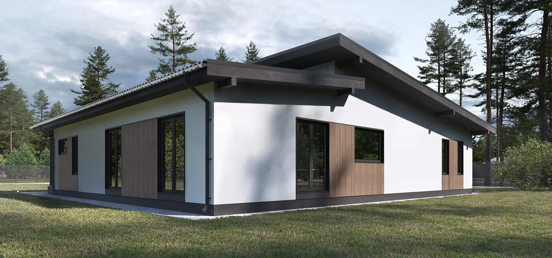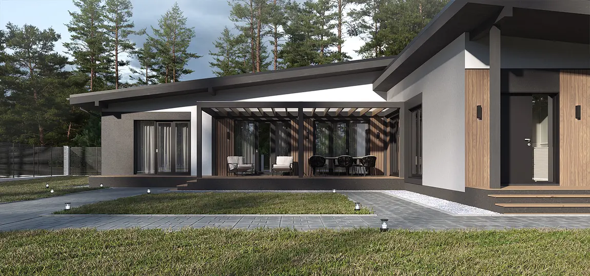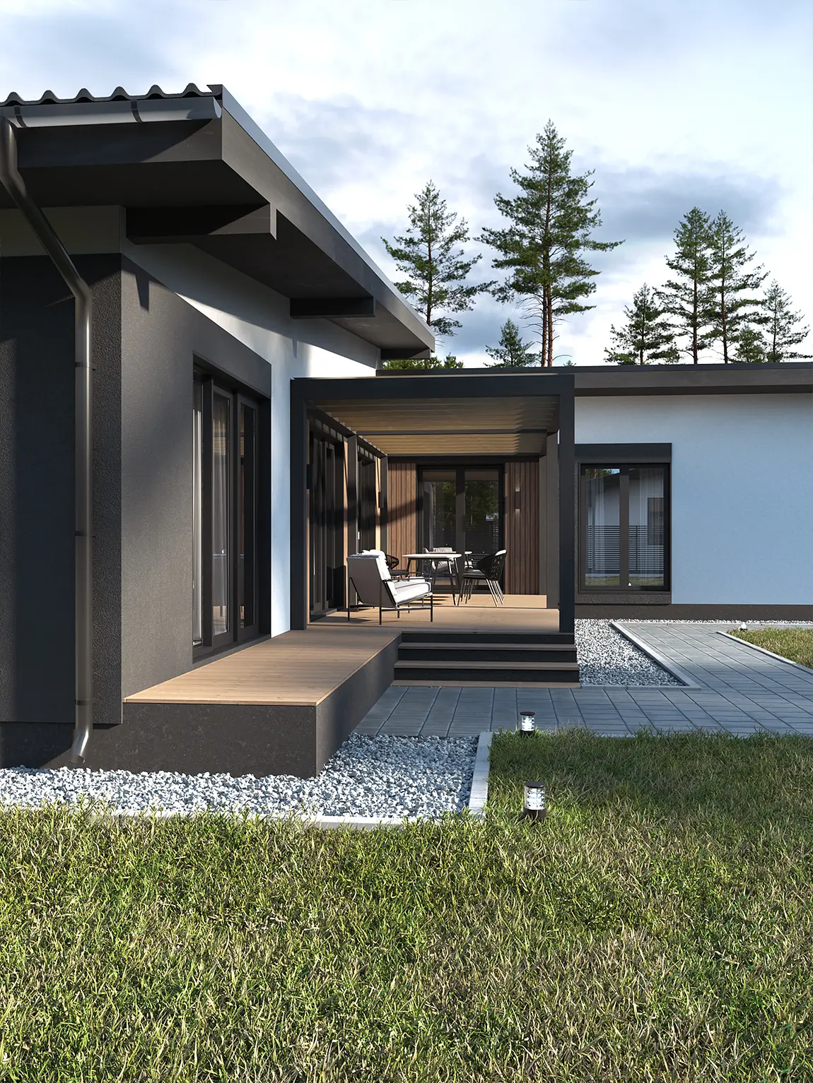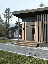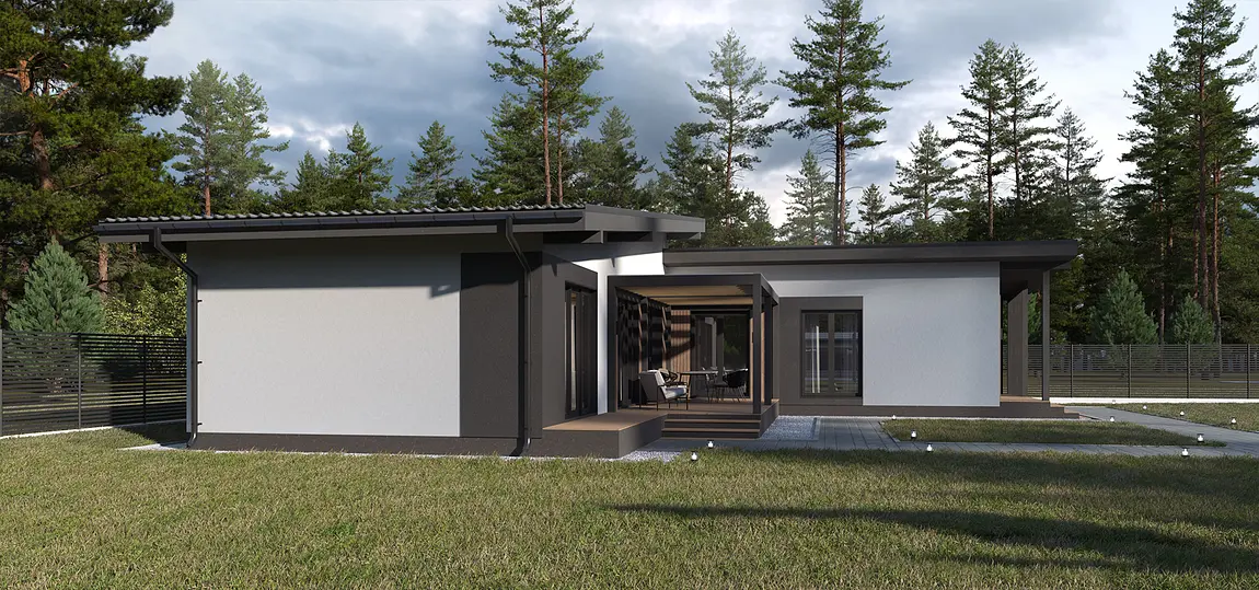 Проект разрабатывался для комплексной застройки жилого района в коттеджном поселке. Застройщиком был выбран единый Скандинавский стиль. Уникальное свойство - планировочное решение, которое может изменятся в своих пропорциях за счет колличества помещений, в зависимости от потребности конечного потребителя. Форма планировки Г- образная, данное решение разрабатывалось для участков ориентированных на северную сторону. Архитектурный код фасада: штукатурка в белом и графитовом цвете, деревянные вставки и элементы.