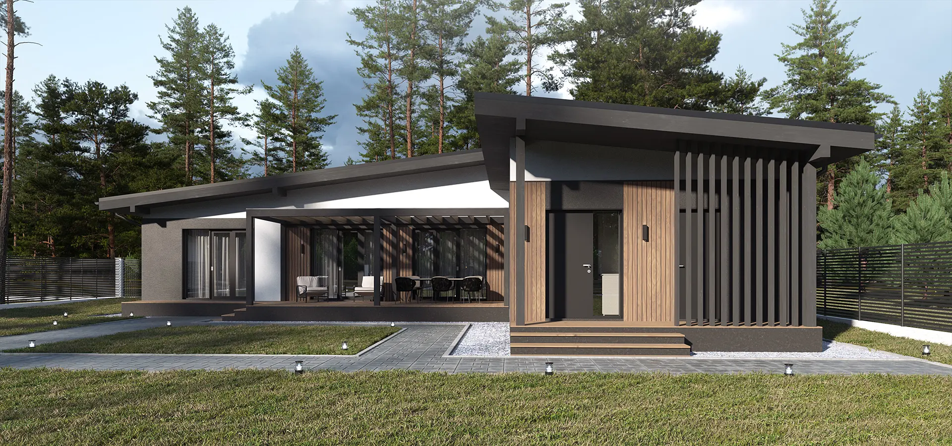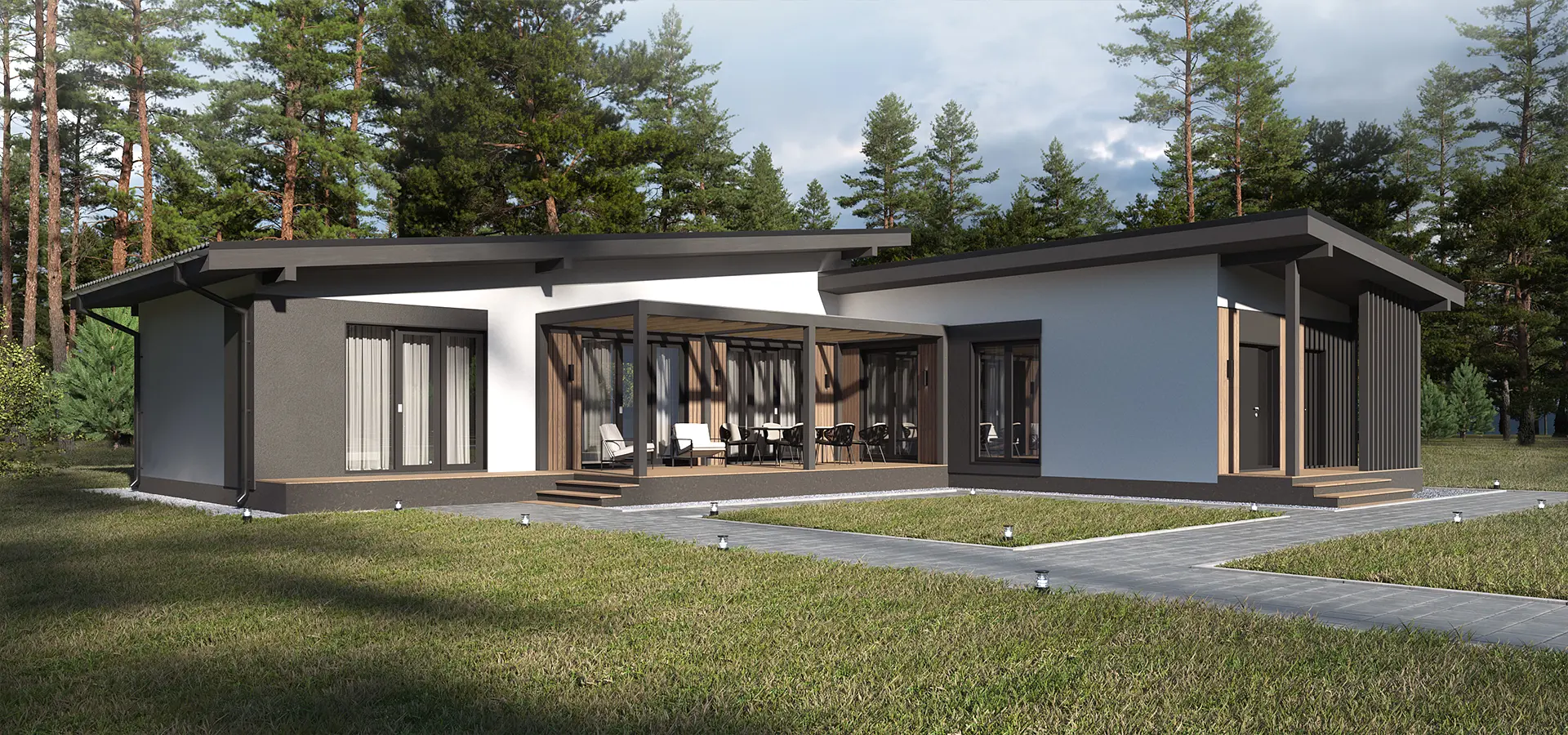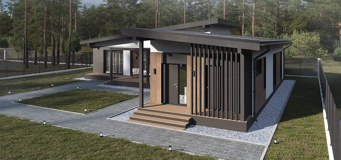 Проект разрабатывался для комплексной застройки жилого района в коттеджном поселке. Застройщиком был выбран единый Скандинавский стиль. Уникальное свойство - планировочное решение, которое может изменятся в своих пропорциях за счет колличества помещений, в зависимости от потребности конечного потребителя. Форма планировки Г- образная, данное решение разрабатывалось для участков ориентированных на северную сторону. Архитектурный код фасада: штукатурка в белом и графитовом цвете, деревянные вставки и элементы.