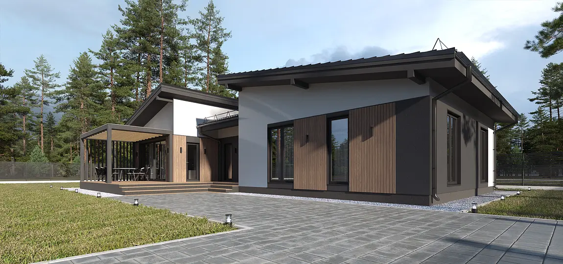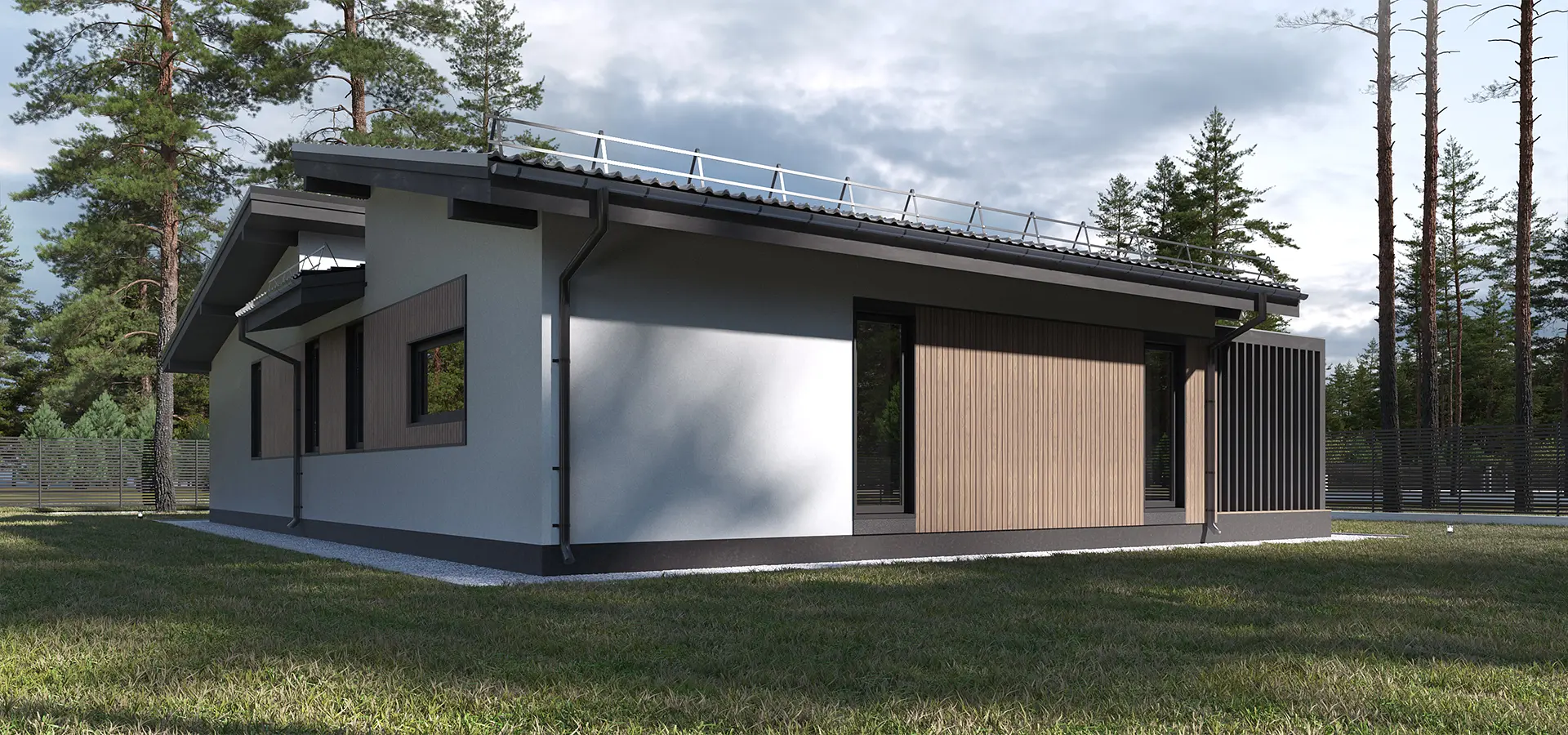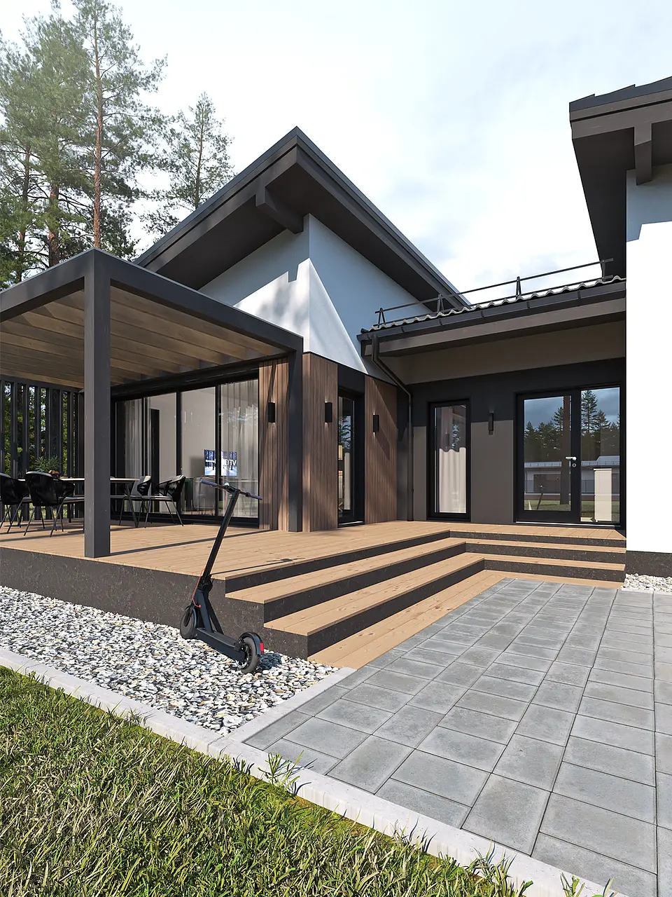 Проект разрабатывался для комплексной застройки жилого района в коттеджном поселке. Застройщиком был выбран единый Скандинавский стиль. Уникальное свойство - планировочное решение, которое может изменятся в своих пропорциях за счет колличества помещений, в зависимости от потребности конечного потребителя. Планировка делится на 3 зоны: общественная, техническая, жилая. Архитектурный код фасада: штукатурка в белом и графитовом цвете, деревянные вставки и элементы.