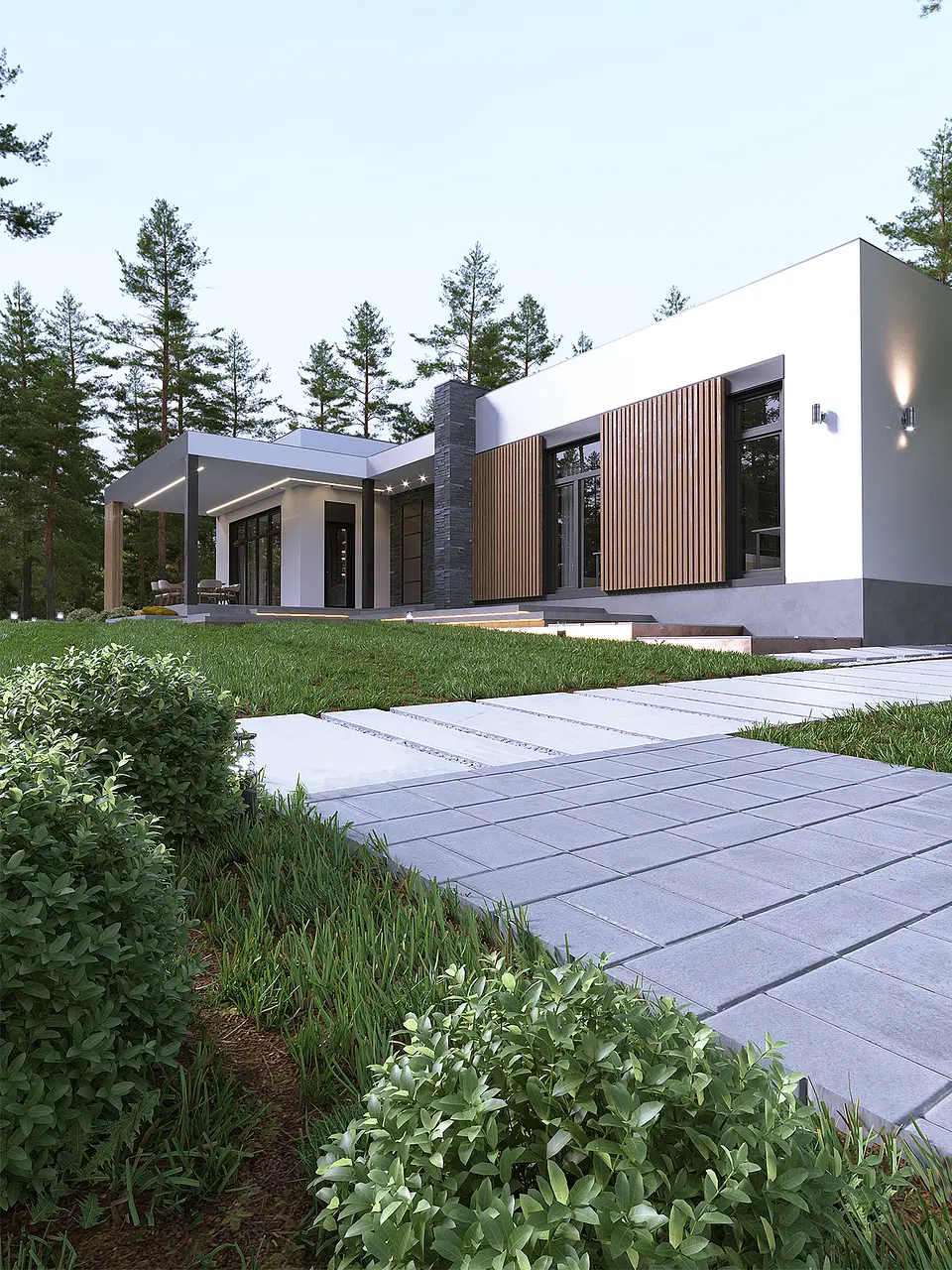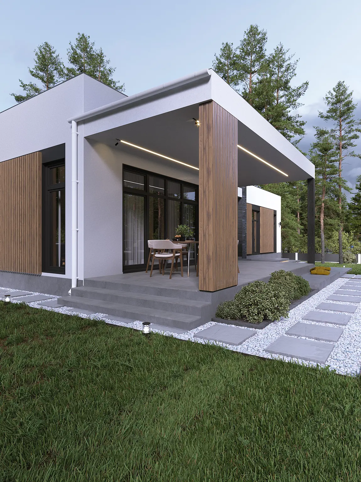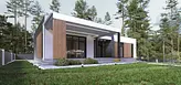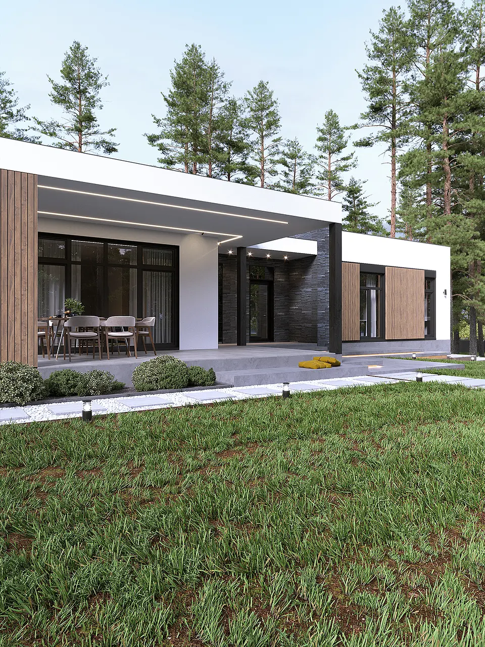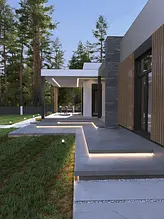 Основная задача стояла при создании данного проекта - оптимальность. Она должна была быть во всем: планировочное решение, интерьер, экстерьер, но не без потери качества и комфорта. Таким образом планировка делится на 3 независимые зоны, в общественной было принято решение увеличить высоту потолков до 3,1 м., а в технической и спальной стандартные 2,8 м. Разный уровень потолков положительно сказалось на экстерьере придав дополнительную пластику. Входная группа была выделена за счет отделки натуральным камнем, придав благородный вид. Деревянный планкен, в виде фасадных вставок, гармонично продолжил тематику "Эко дизайна".