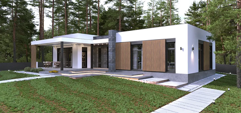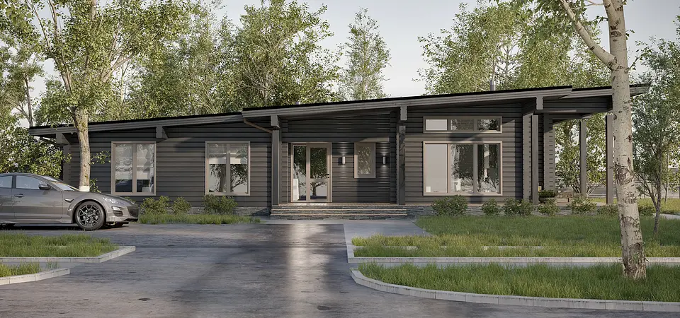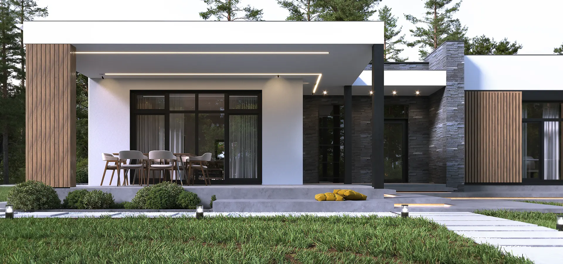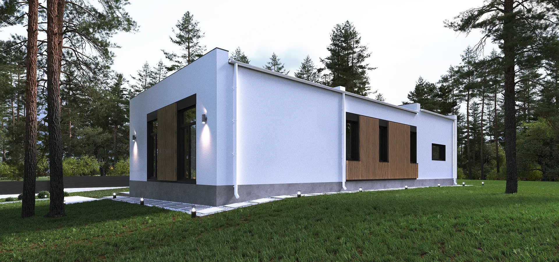 Основная задача стояла при создании данного проекта - оптимальность. Она должна была быть во всем: планировочное решение, интерьер, экстерьер, но не без потери качества и комфорта. Таким образом планировка делится на 3 независимые зоны, в общественной было принято решение увеличить высоту потолков до 3,1 м., а в технической и спальной стандартные 2,8 м. Разный уровень потолков положительно сказалось на экстерьере придав дополнительную пластику. Входная группа была выделена за счет отделки натуральным камнем, придав благородный вид. Деревянный планкен, в виде фасадных вставок, гармонично продолжил тематику "Эко дизайна".