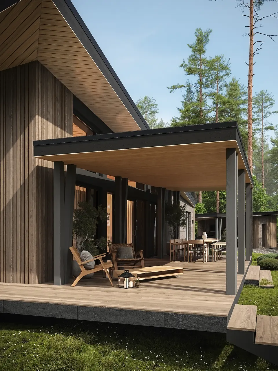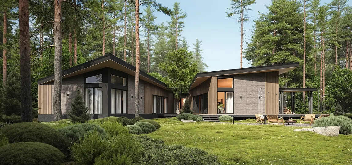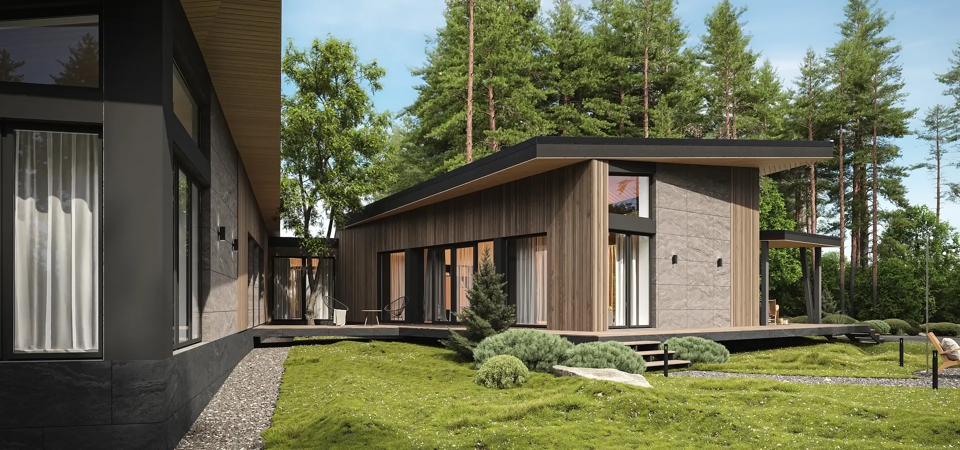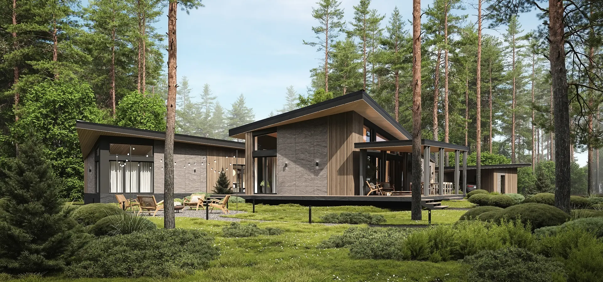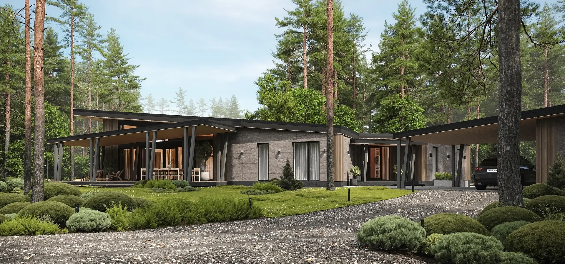 V-victory. Победа над гравитацией и пространством, дом словно парит над участком и уходит в проекцию. Прогрессивный дизайн, иначе не назовёшь. Строение словно теряется в пространстве этого мира, оси большинства стен не параллельны и имеют свой вектор, свое направление. Немного о земном, планировочное решение было сформировано с учетом особенностей участка, в центре которого расположился хвойный собственный участок леса, по этому дом был размещен на дальней стороне. Левый блок, ориентирован на южную сторону, по этому он освещен с самого рассвета и до заката, а большое количество панорамных оконных блоков создают максимальную светопрозрачность. Правый блок ориентирован на северную сторону, окна которого выходят в лес, создавая единение с природой, полностью абстрагируясь от этого мира. Динамику дома повторяет хозяйственный блок и навес на два автомобиля.