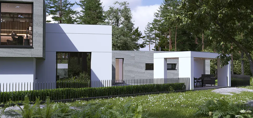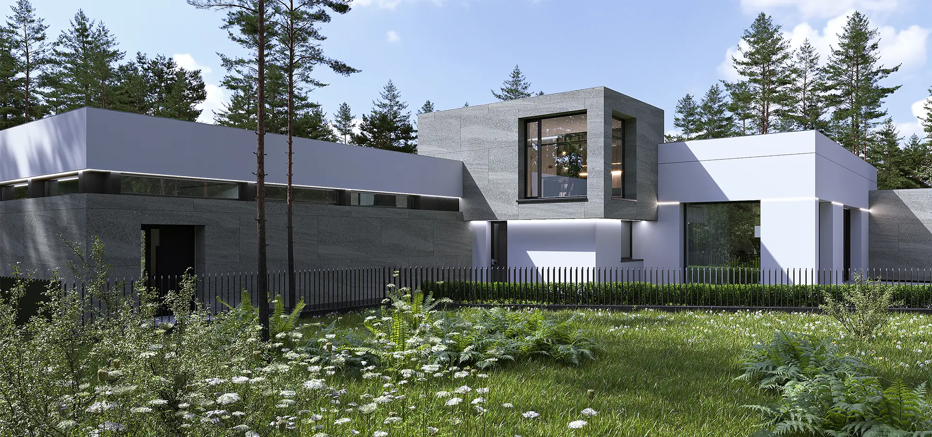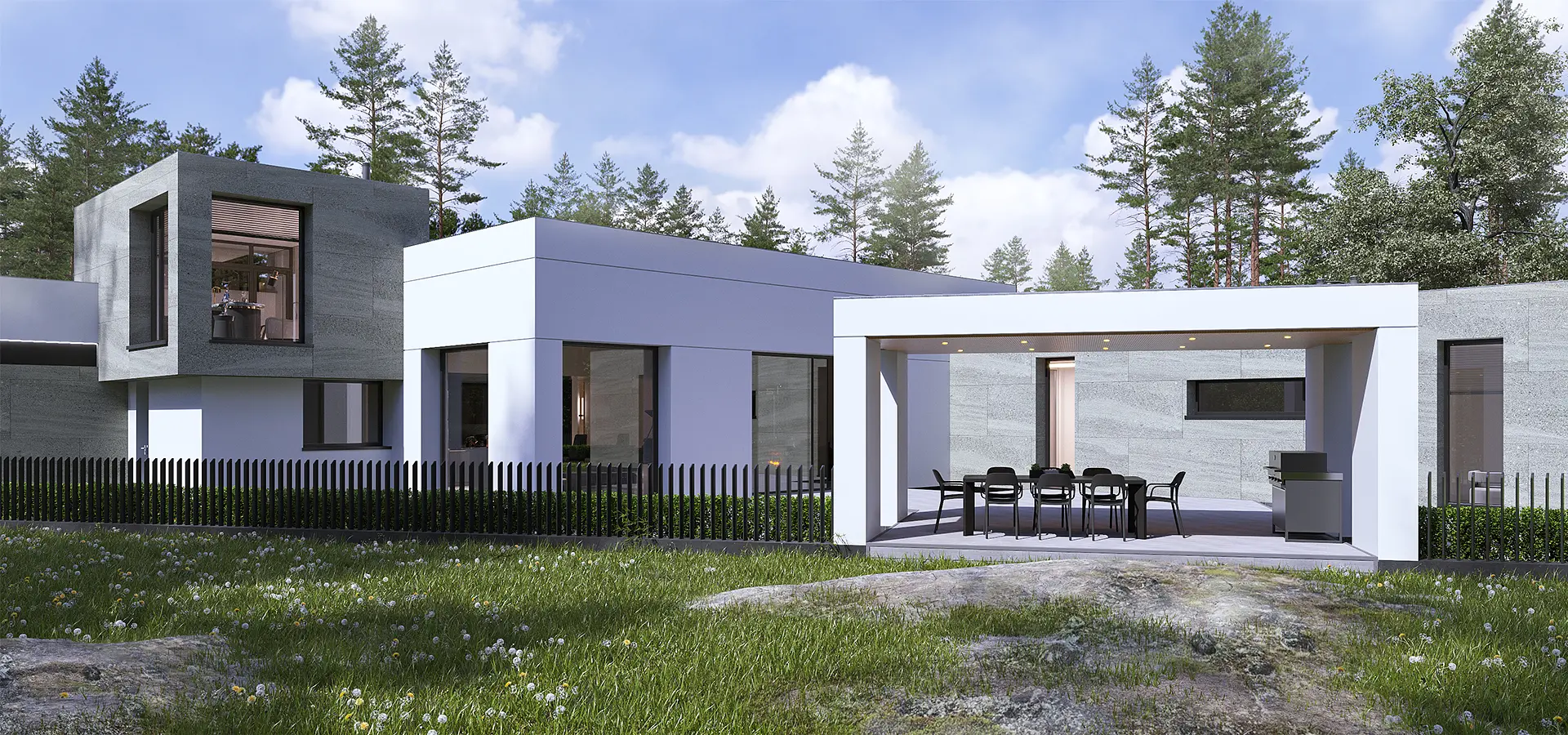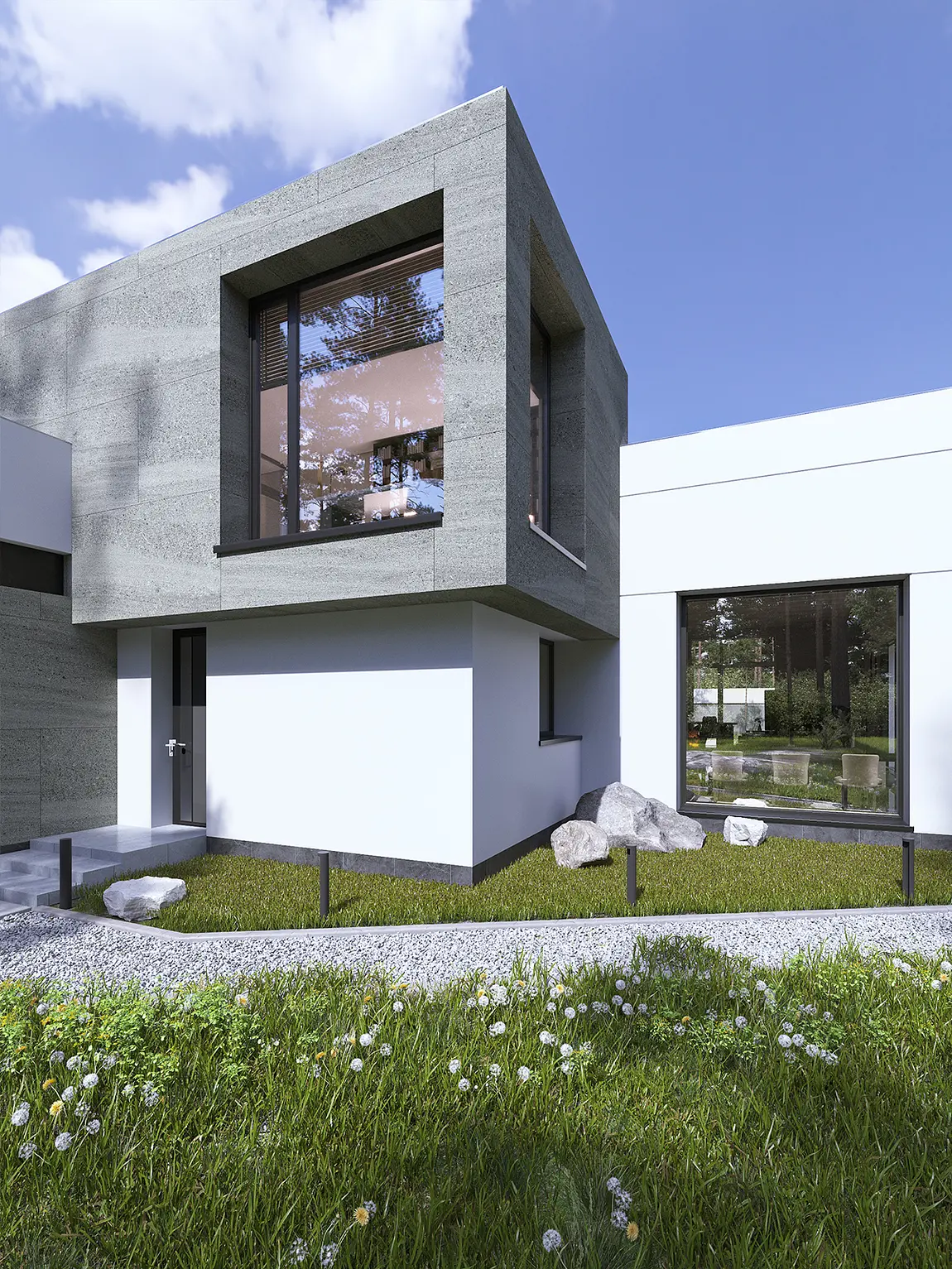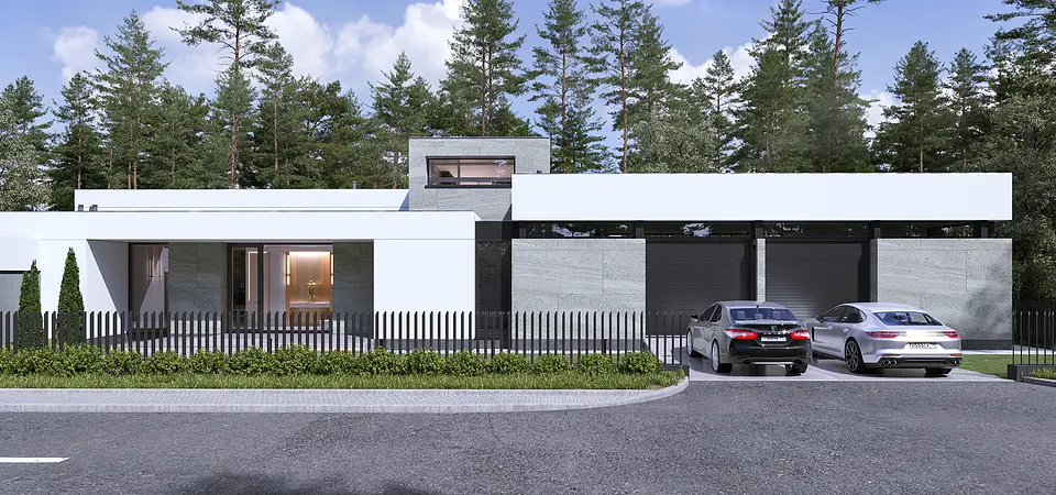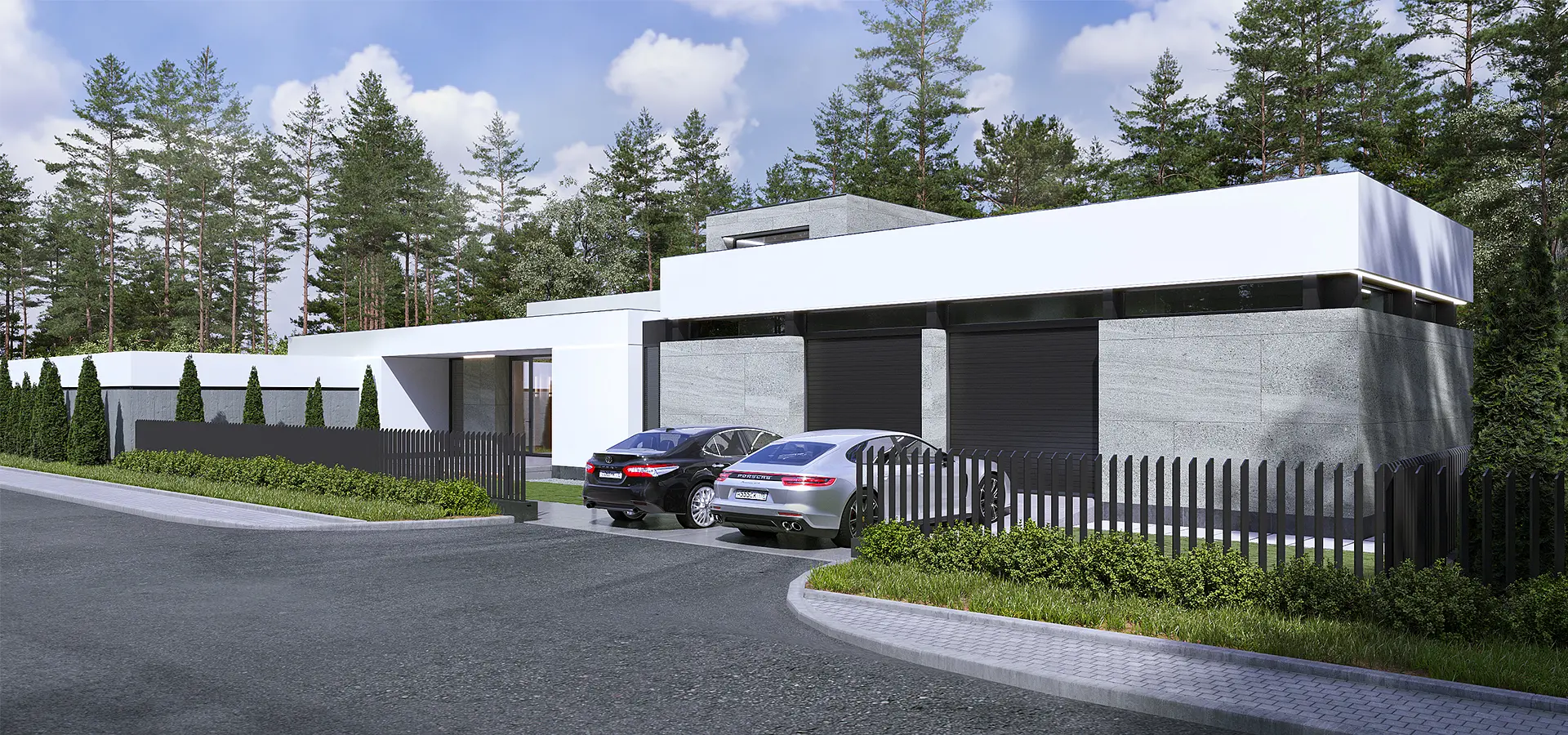 Загородный дом для постоянного проживания большой семьи. Задача стояла создать комфортное пространство для большого количества проживающих. Детские комнаты были вынесены в отдельный блок, в котором также расположилась игровая комната и зона для няни. Для родителей был сформирован отдельный мастер-блок. Уникальность в том, что эти два блока находятся в разных концах дома, но всегда сохраняется прямой доступ и визуальный контроль. Наличие разных террас дает возможность уединения и нахождения всегда на солнечной стороне. Отдельно стоящая пергола создает приватную зону и не мешает проникновению солнечного света в гостиную. Отдельно нужно отметить зону гаража с мастерской и собственным лестничным маршем в кабинет на 2ом уровне, который консольно свисает над фасадом.