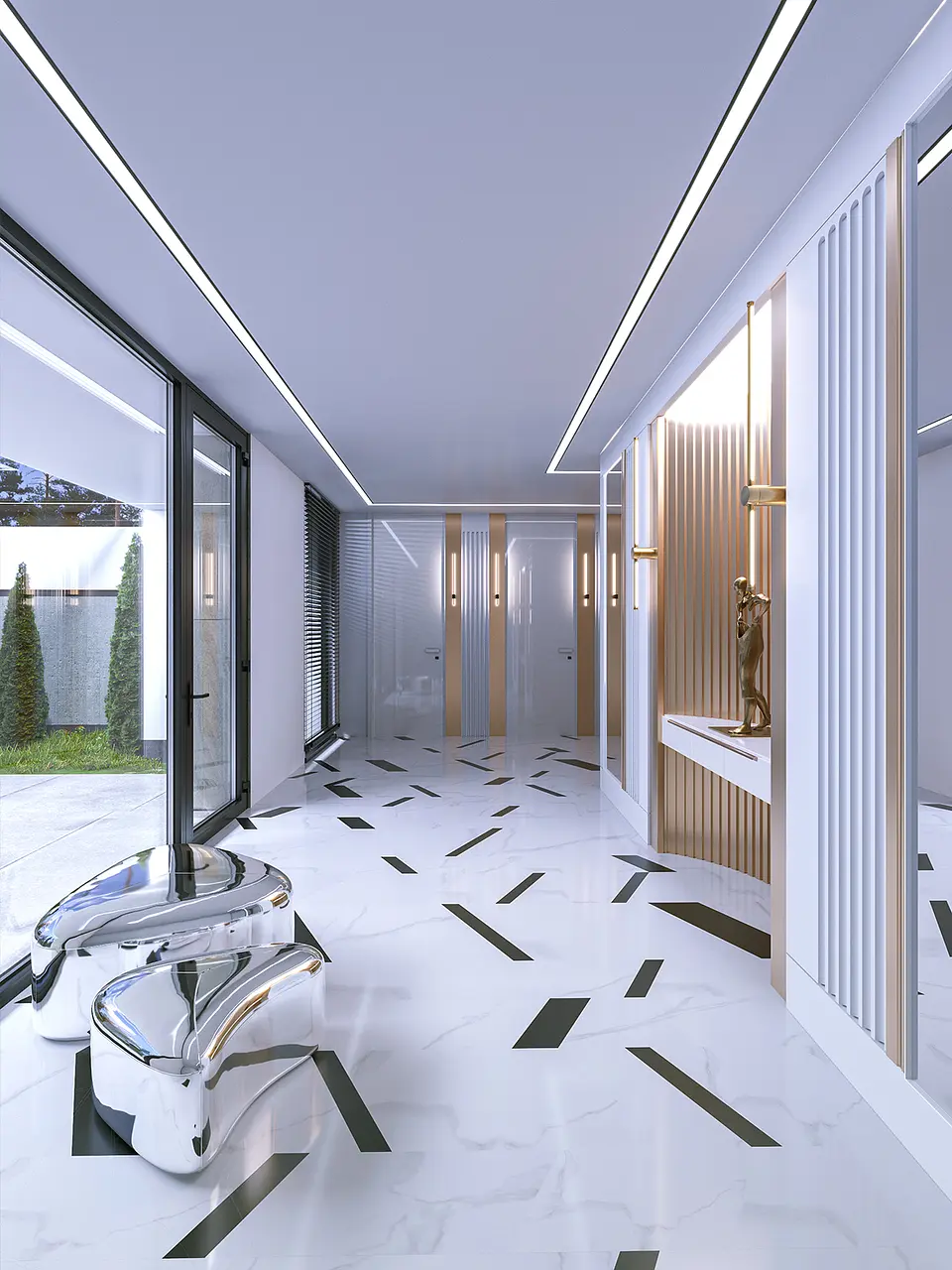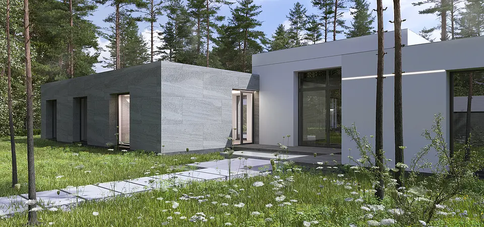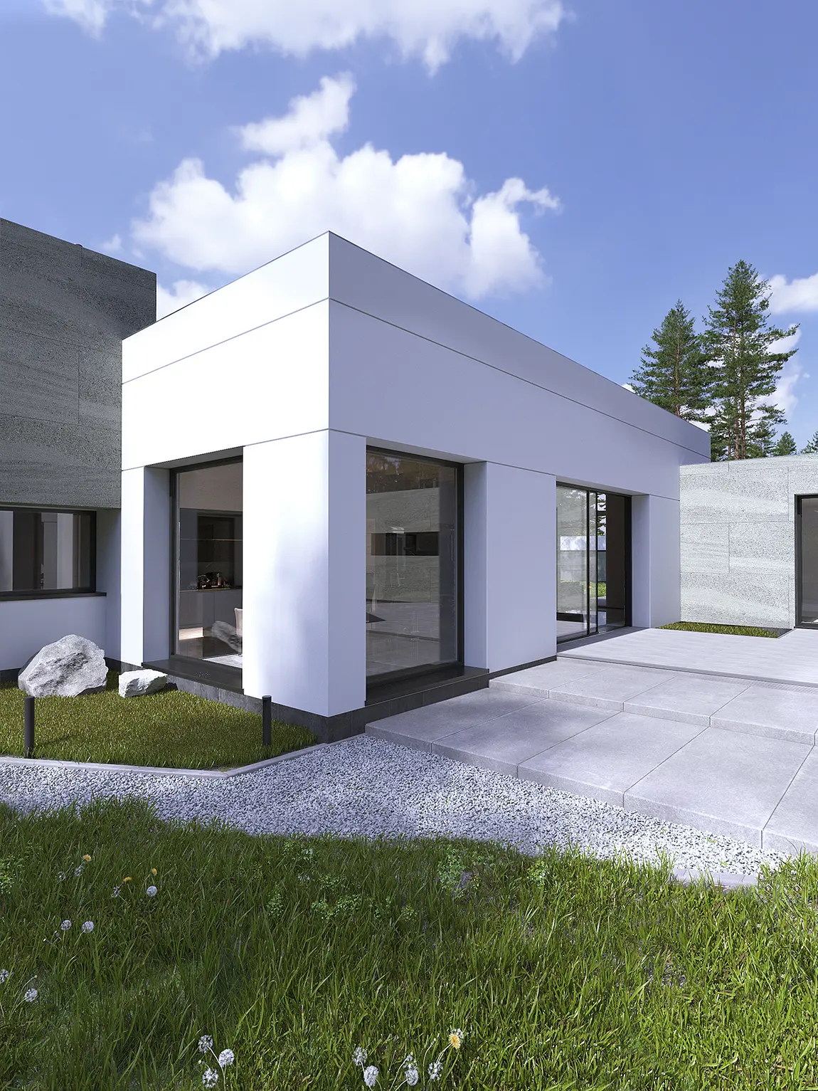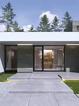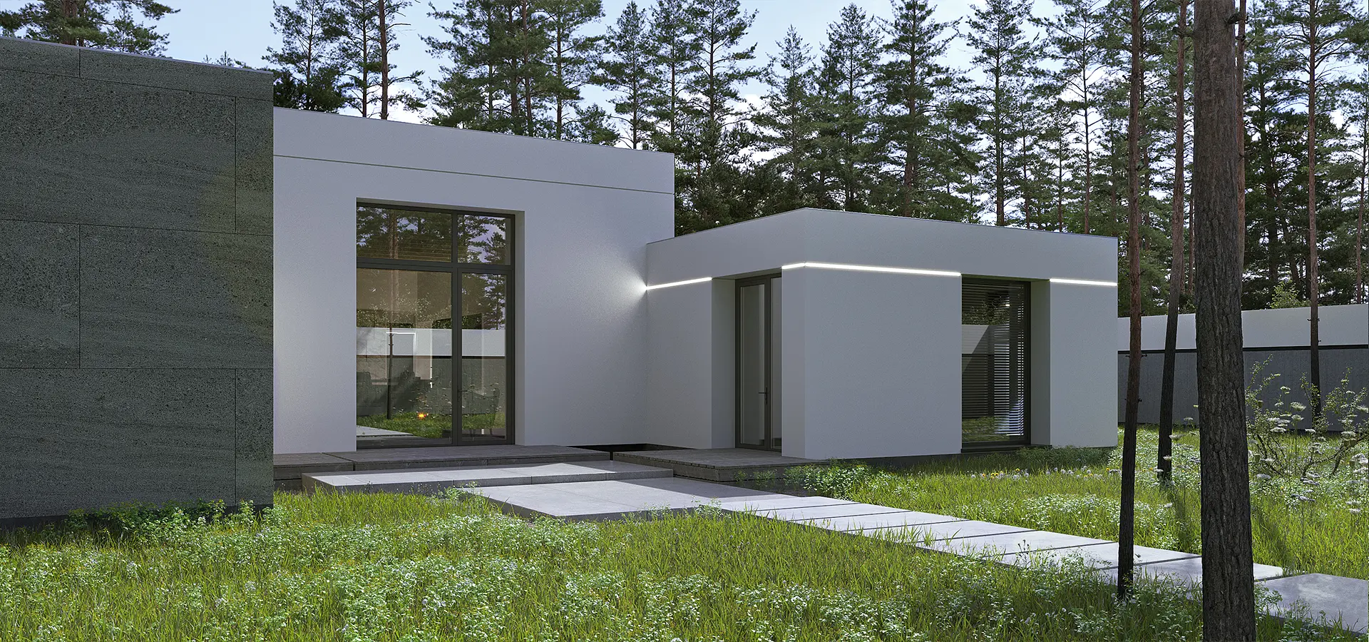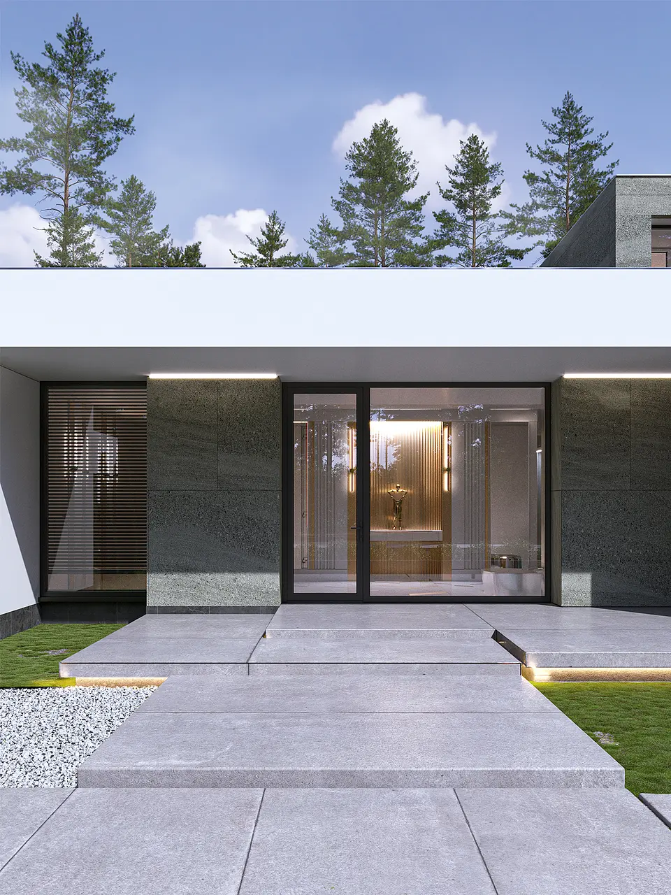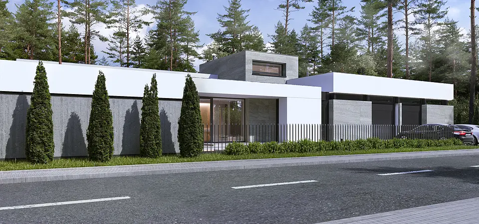 Загородный дом для постоянного проживания большой семьи. Задача стояла создать комфортное пространство для большого количества проживающих. Детские комнаты были вынесены в отдельный блок, в котором также расположилась игровая комната и зона для няни. Для родителей был сформирован отдельный мастер-блок. Уникальность в том, что эти два блока находятся в разных концах дома, но всегда сохраняется прямой доступ и визуальный контроль. Наличие разных террас дает возможность уединения и нахождения всегда на солнечной стороне. Отдельно стоящая пергола создает приватную зону и не мешает проникновению солнечного света в гостиную. Отдельно нужно отметить зону гаража с мастерской и собственным лестничным маршем в кабинет на 2ом уровне, который консольно свисает над фасадом.