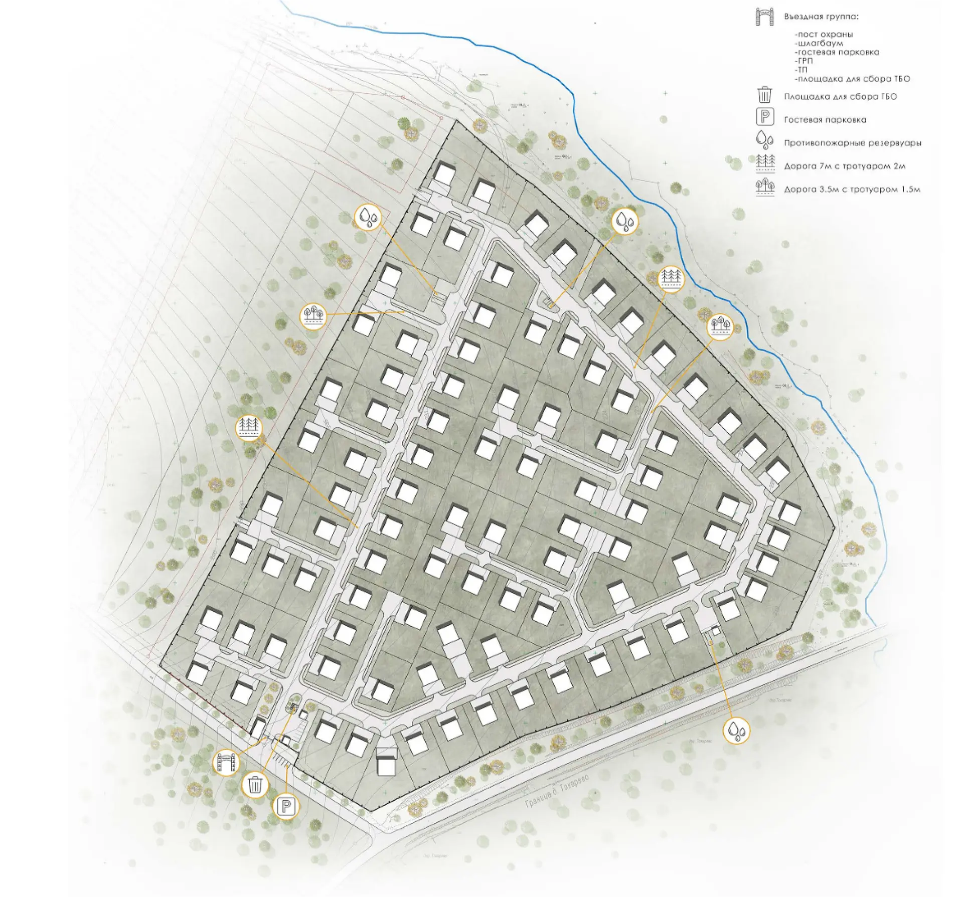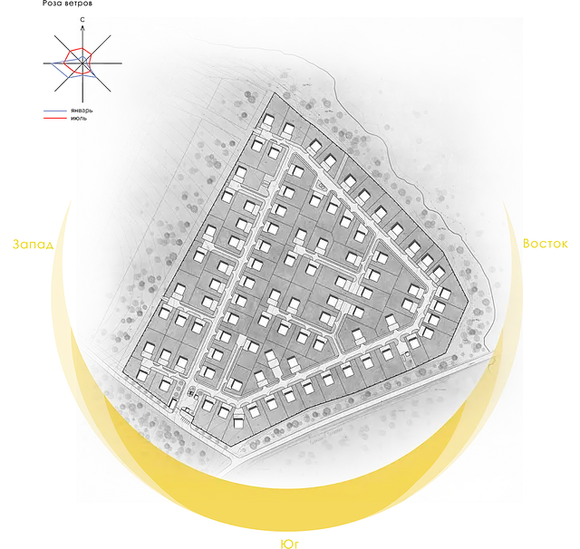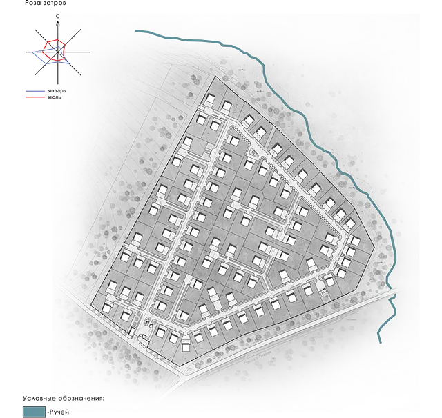 Большим плюсом территории, на которой запроектирован жилой посёлок, являетсято, что она расположена на склоне холма, благодаря этому открываются восхититель ные пейзажи на реку Сысерть и горные хребты.
